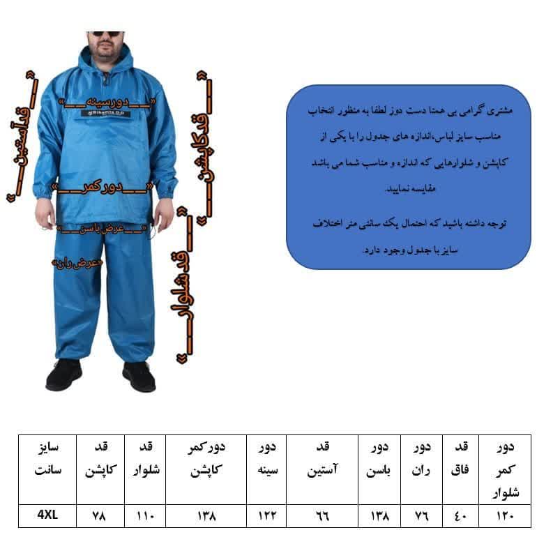 کاپشن و شلوار بادگیر ضدآب مدل دنا کد BLUE 4XL NEW DENA رنگ مشکی سایز خیلی بزرگ از بهترین پارچه ضدآب لیزری وارداتی موجود در داخل بازار کشور تهیه و تولید شده است. این کاپشن و شلوار برای ورزش ، کوهنوردی ،کار در فضاهای روباز ،بارانی و بادگیر بسیار مناسب بوده و به دلیل پارچه لیزری ضدآب پوشش بسیار مناسبی در برابر باران و باد می باشد. ابعاد این کاپشن و شلوار به گونه ای طراحی شده است که به راحتی بر روی لباس های شما قابلیت پوشیدن را دارد و به راحتی نیز قابل تعویض می باشد. این کاپشن دارای یک جیب مخفی بوده که برای درب آنیک عدد زیپ مرغوب نمره پنج کاپشنی تعبیه شده است. این جیب در جلوی کاپشن قرار گرفته است و برای قرار دادن مدارک ،کیف پول و موبایل با ابعاد 20 در30 سانتی متر مناسب می باشد. مچ های آستین کاپشن با کش دوسانت کش دوزی شده و به منظور زیبایی و دوام بیشتر مجدد دوبل شده است. به گونه ای که سفیدی کش های مچ آستین به هیچ عنوان دیده نمی شود. دمپاهای شلوار به منظور جلوگیری از ورود باد و باران با کش های 2 سانتی کش دوزی گردیده و جهت زیبایی و دوام بیشتر مجددا دوبل شده به گونه ای که سفیدی کش های شلوار دیده نمی شود. به منظور راحتی در پوشیدن و در آوردن کاپشن بادگیر و دوام بیشتر در جلوی کاپشن و بر خلاف جنس های نامرغوب و سری دوزی موجود در بازار که از زیپهای شلواری ضعیف و نامرغوب و ارزان استفاده می کنند ما از زیپ کاپشنی مرغوب سایز 5 دندانه پلاستیکی ماشین فلزی قفل دار که دارای طول عمر بالایی می باشد.برای باز و بسته نمودن جلوی یقه استفاده نموده ایم.که علاوه بر زیبایی باعث دوام و طول عمر بیشتر وایجاد تفاونت آشکار در کیفیت لباس گردیده است. . این کاپشن و شلوار بادگیر سایز خیلی بزرگ بوده و برای افراد با سایز های 40تا54 تا قد 190 سانت با هیکل متوسط تا هیکل درشت و دور شکم حداکثر130 سانت بسیار مناسب می باشد. به منظور دوام و راحتی بیشتر و بر خلاف مدل های ارزان قیمت و سری دوزی موجود در بازار و جهت راحتی فاق شلوار بلند در نظر گرفته شده و جهت جلوگیری از پارگی خشتک در هنگام کار و فعالیت به قسمت بالای رانها مرغک اضافه شده است.این لباس را به راحتی می توانید با سایر لباس های رنگی داخل ماشین لباسشویی ریخته و با مایع لباسشویی و در دمای 30تا40 درجه سانتیگراد شست وشو نمایید.